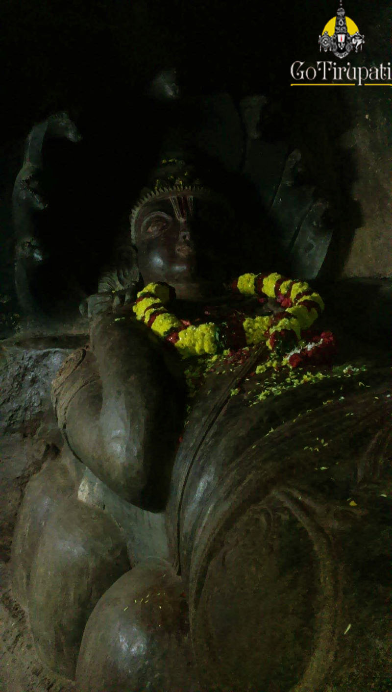 Ananta Padmanabha Swamy Temple Undavalli Caves is a four-storeyed rock-cut cave located in Tadepalle Mandal. Lord Siva, Lord Vishnu and Lord Brahma shrines are located here. It is believed that there is an underground passage between Undavalli Caves and Mangalagiri Temple which is 8 km in length. In the first floor, images of Lord Vishnu, Lord Siva and Lord Brahma were carved on the rocks. In the second floor, there is an idol of Anantha Padmanabha Swamy in the recumbent posture was sculptured out of a single rock which is 20 ft long. In the third floor, an unfinished triple shrine of Vishnu, Siva and Brahma is located. Currently, this site is under the maintenance of the Archaeological department of India.