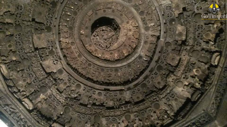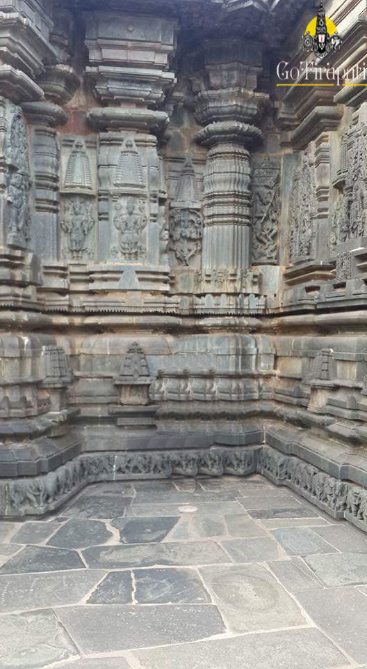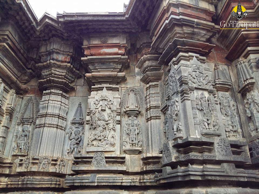 The main shrine of Chennakesava also known as Vijaya Narayana is in the centre of the enclosure on a pedestal. The temple has an arched doorway to the shrine. Idol is of 2 mt height in the sanctum sanctorum, this idol was mutilated by the Muslim invaders. The massive domed ceiling in the centre, supported by the four pillars. Scenes from Ramayana can be seen on the temple walls. 10000 sculptures of 2 – 4′ high, 200 depictions of women hairstyles, and artisanship so fine that you see a fly on a bunch of grapes.