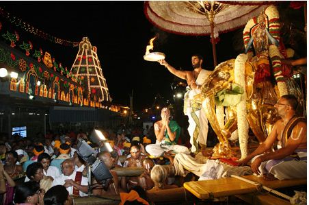 The procession of Lord Malayappa well decorated with jewellery of pearls, diamonds and other precious stones atop the Elephant vehicle is a celestial sight for all of his devotees.