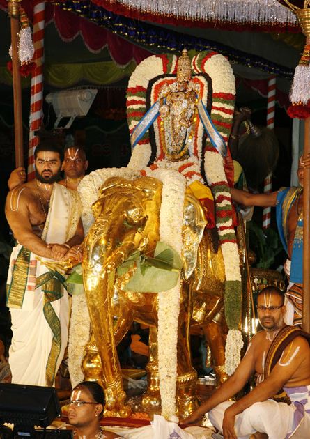 The richness of hindu mythology lies in its generosity to provide a respectable position of worship even for various species of fauna. Starting from Cow to Crow each of these creatures have a revered place in Hindu scriptures. Among those blessed creatures, the mighty elephant occupies a pride place being the vehicle of Goddess Laxmi Devi, the Consort of Lord Vishnu. To appease His consort as well to bless the devotees with prosperity lord takes a pleasure ride on Gaja Vahanam.