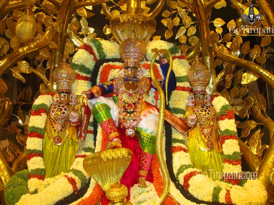 Kalpavriksha, in particular, is said to be planted at Mt. Meru peak in the middle of Indra’s five paradise gardens. Flanked by His two divine consorts, Lord alights the glittering, well designed, golden KalpaVruksha Vahanam to show His largesse towards His devotees.