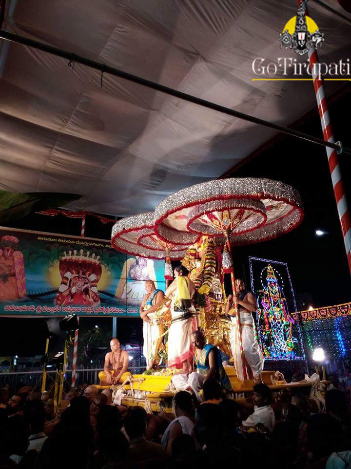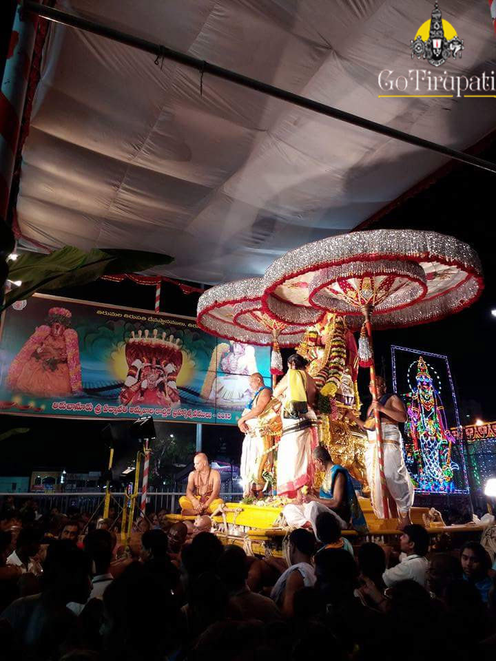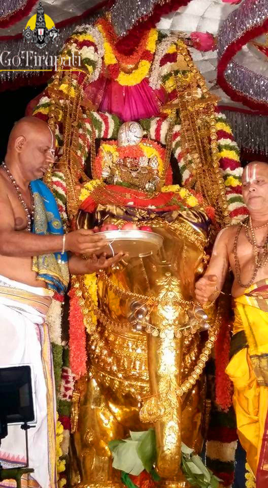 The special jewel-“Lakshmi Kasula Haram” which was brought from the treasury of Her love Sri Venkateswara Swamy, was adorned to Goddess which enhanced the beauty of Goddess Gaja Lakshmi. The pilgrims were mused by the divine charm of “Gaja Gamini” on Saturday evening.