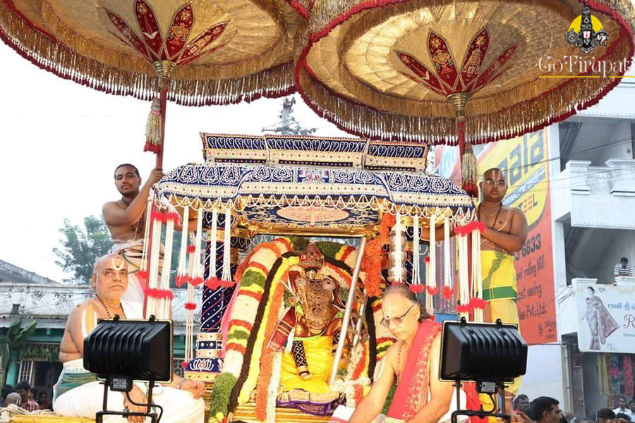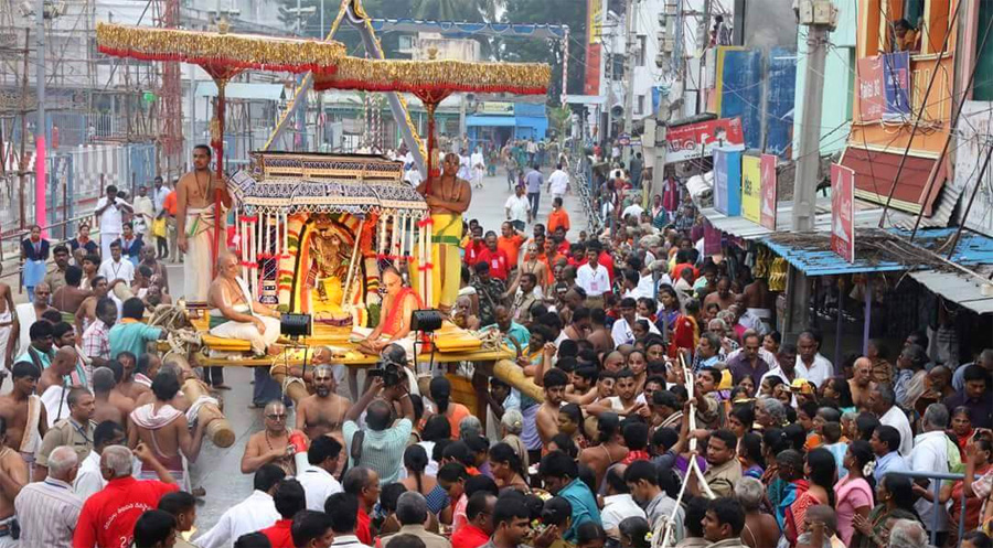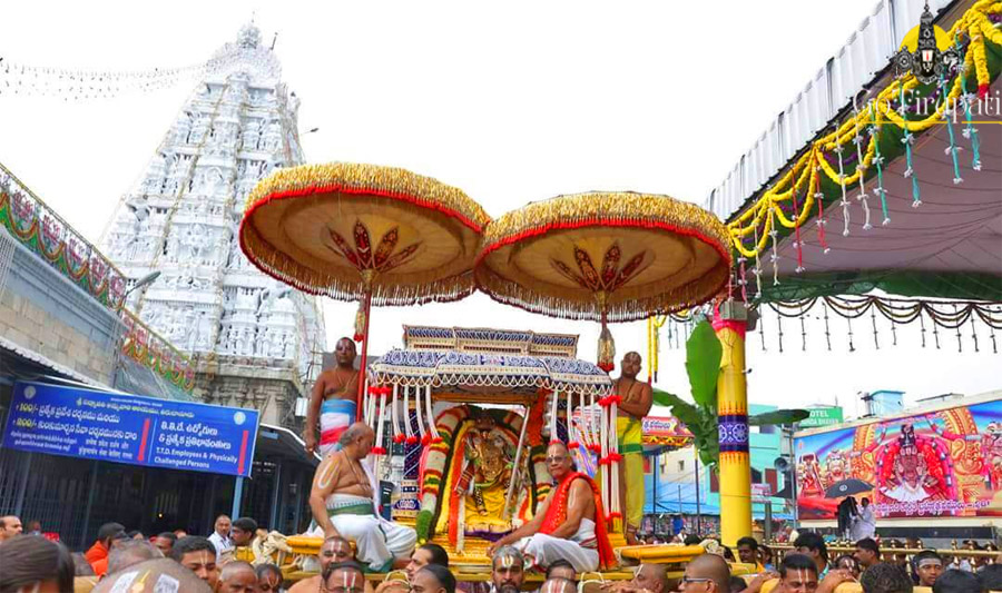 In a traditional way, which is an age old practice in the temple, the Jiyar Swamis of TTD and their disciples led the procession by singing the hymns in praise of the deity.