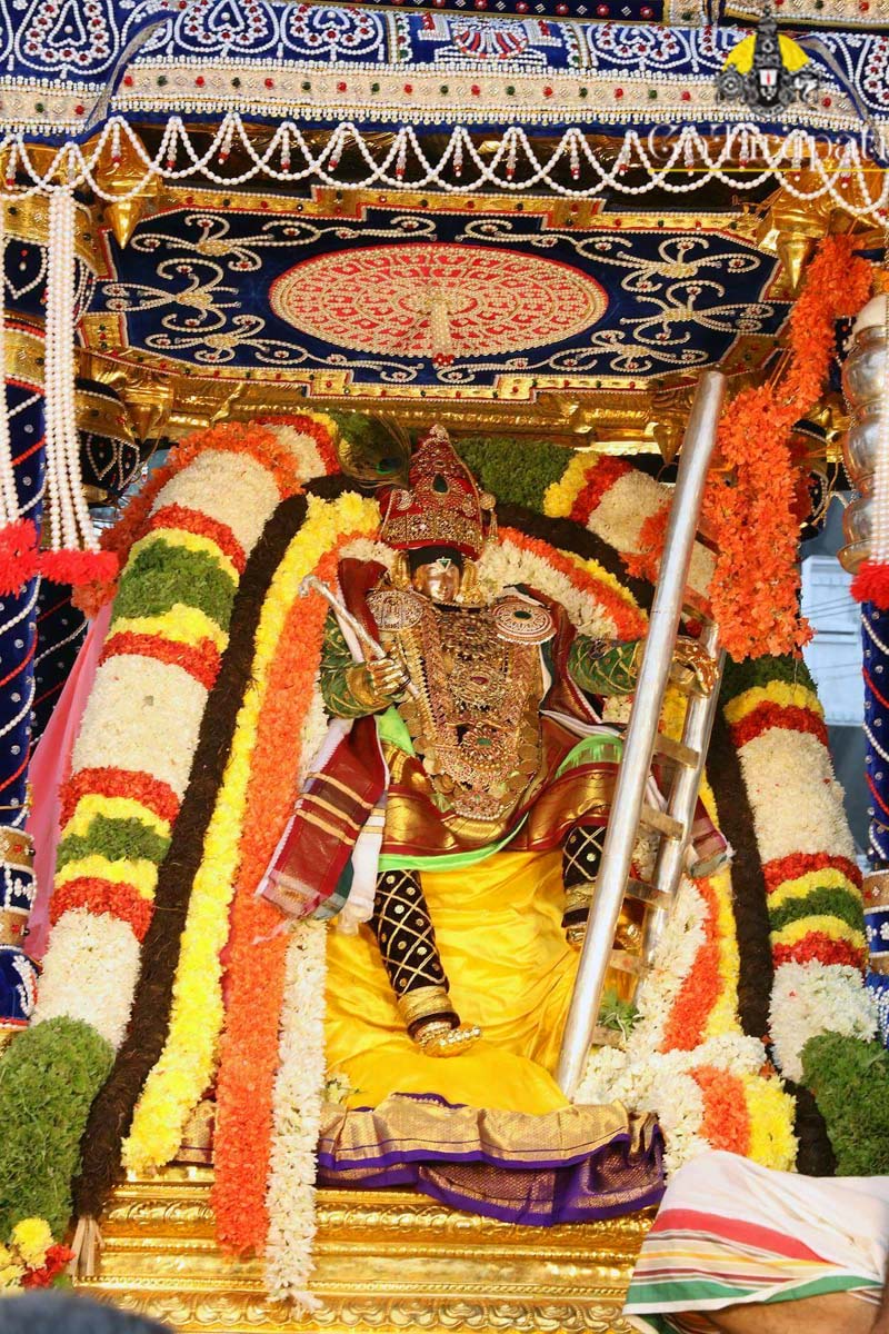 On the third day of the annual Karthika Brahmotsavams, the processional deity of goddess Padmavathi Devi, in the guise of “Kaliya Mardhani” was taken around the four-mada streets of Tiruchanur temple on the ‘Muthyapu Pandiri’ Vahanam-which is made of finest quality natural pearls on Thursday in Tiruchanoor.