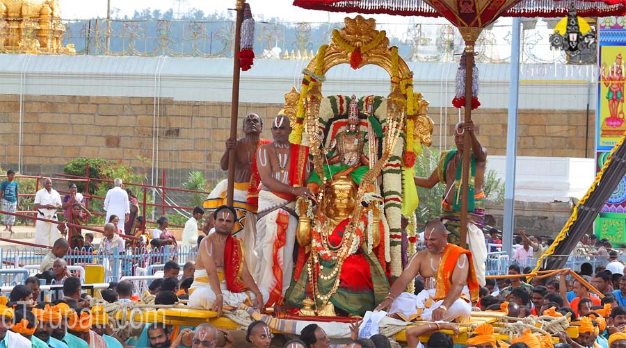 Lord Sri Venkateswara, donning the role of Lord Sri Rama and equipped with a golden bow and arrow, moves along the temple streets (Thiru Maada Streets) mounted atop the Hanumantha Vahanam. Hanuman is not only considered as ardent devotee of Lord Rama but also an exponent of all the four Vedas, besides being an embodiment of wisdom, strength, success and bravery.