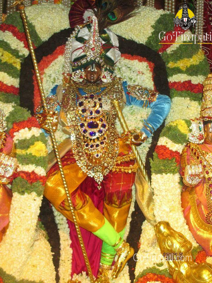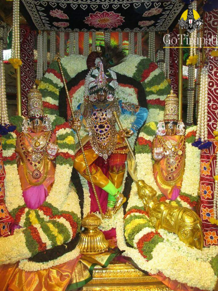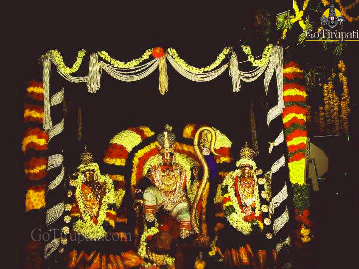 Lord Malayappa along with his two consorts ride the Muthyapu Pandiri Vahanam – a pandal shaped carrier decorated with expensive and resplendent milky white pearls – spreading the message of peace, love and co-existence in society.