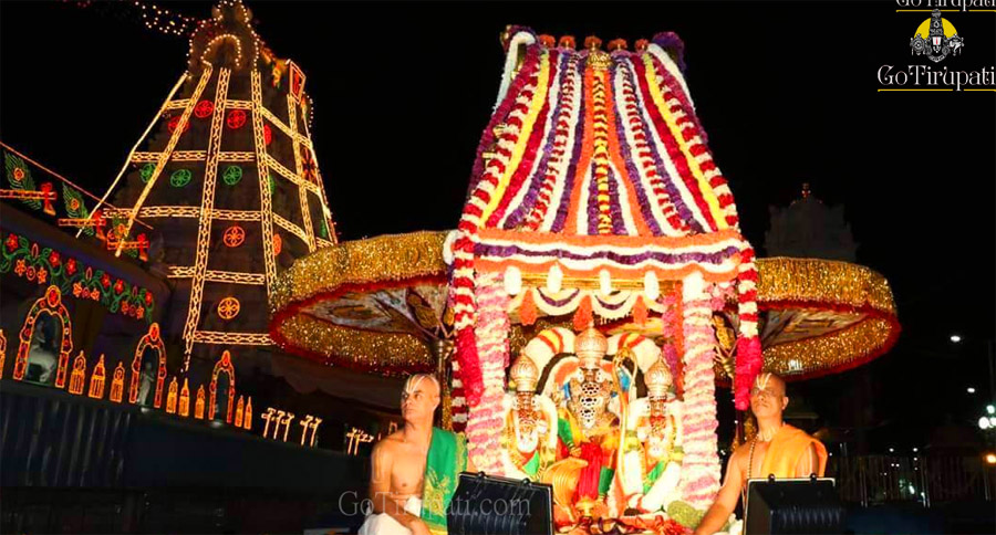 Lord Malayappa Swamy rides on SarvaBhoopala Vahanam and spreading the message that all the Dikpalakas ( guardians of the eight cardinal directions) governing the Universe are under his direct control and vigilance and that mankind prospers with timely rains.