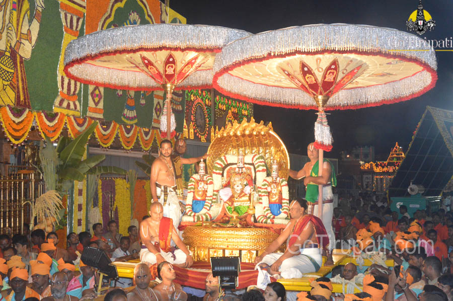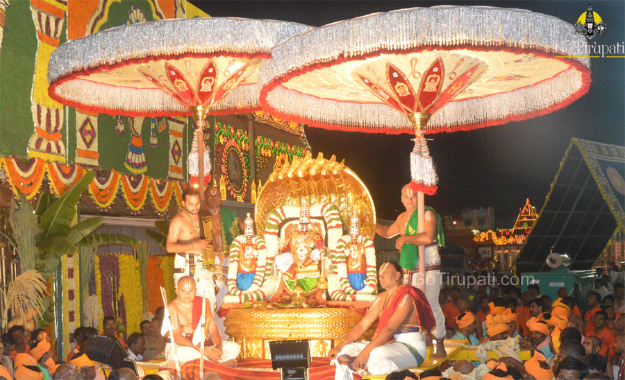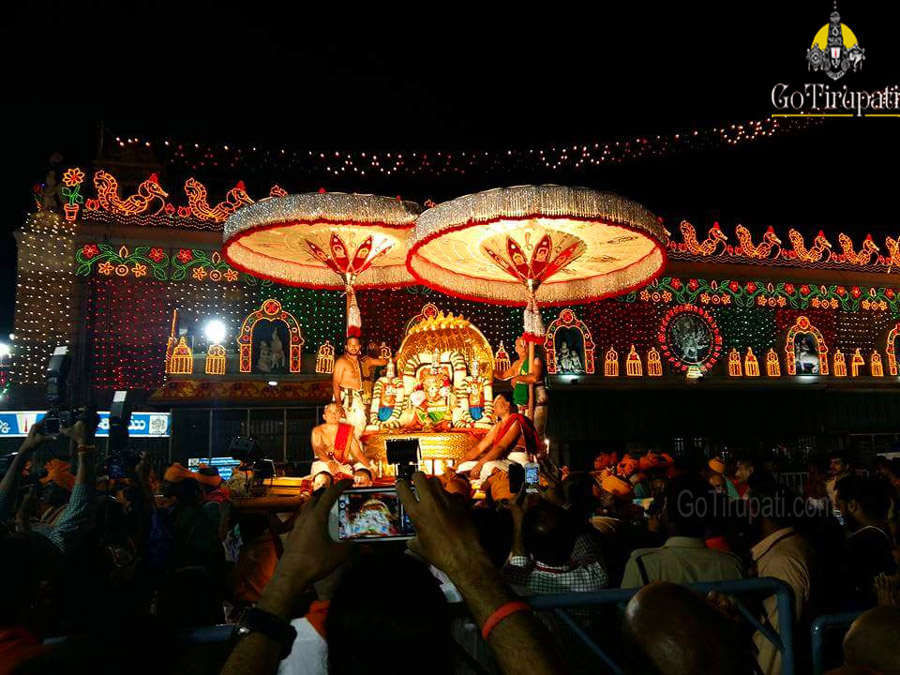 Lord flanked by his two divine consorts SriDevi and BhooDevi and takes a pleasure ride on the mighty seven-hooded serpent, the tastefully decorated golden Pedda Sesha Vahanam. The Seven hoods represents the seven hills of Lord Venkateswara.