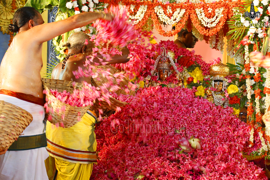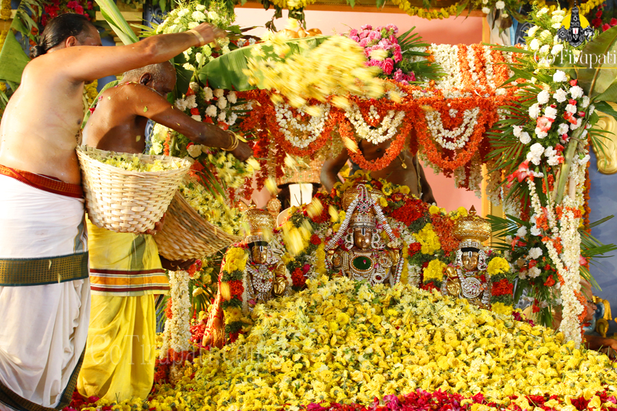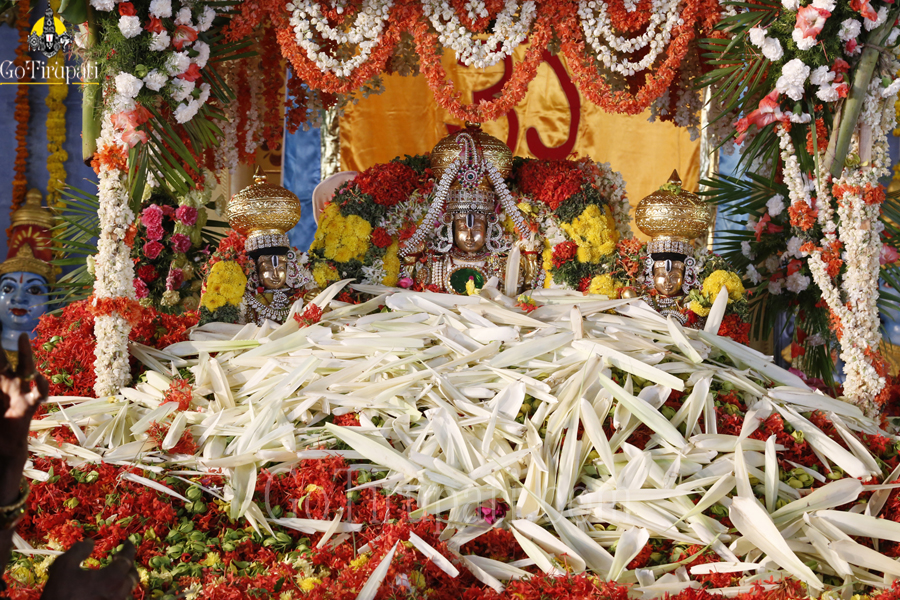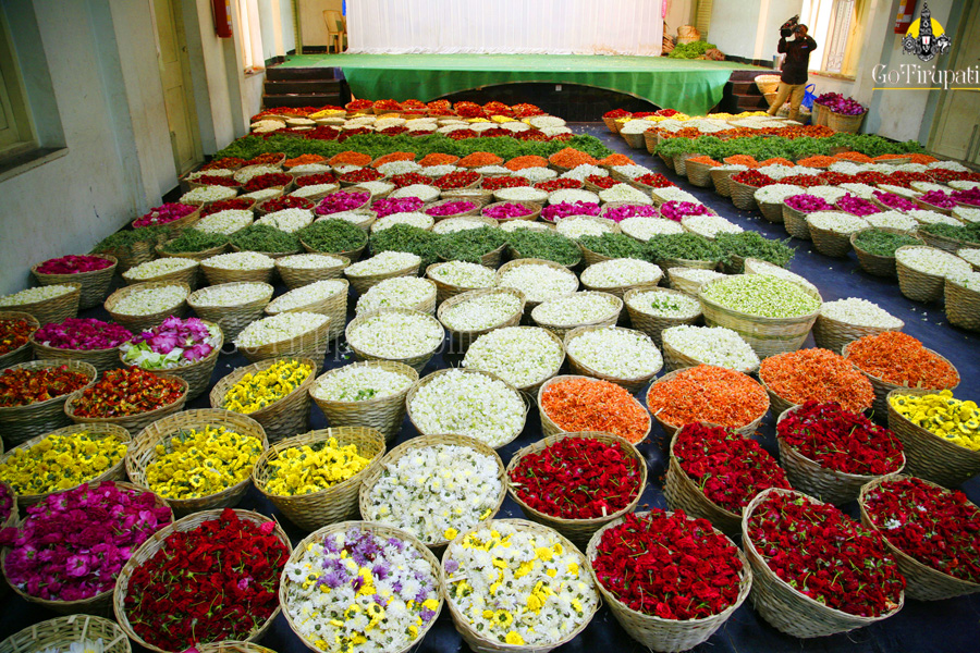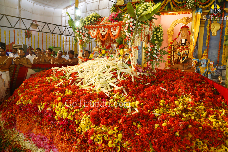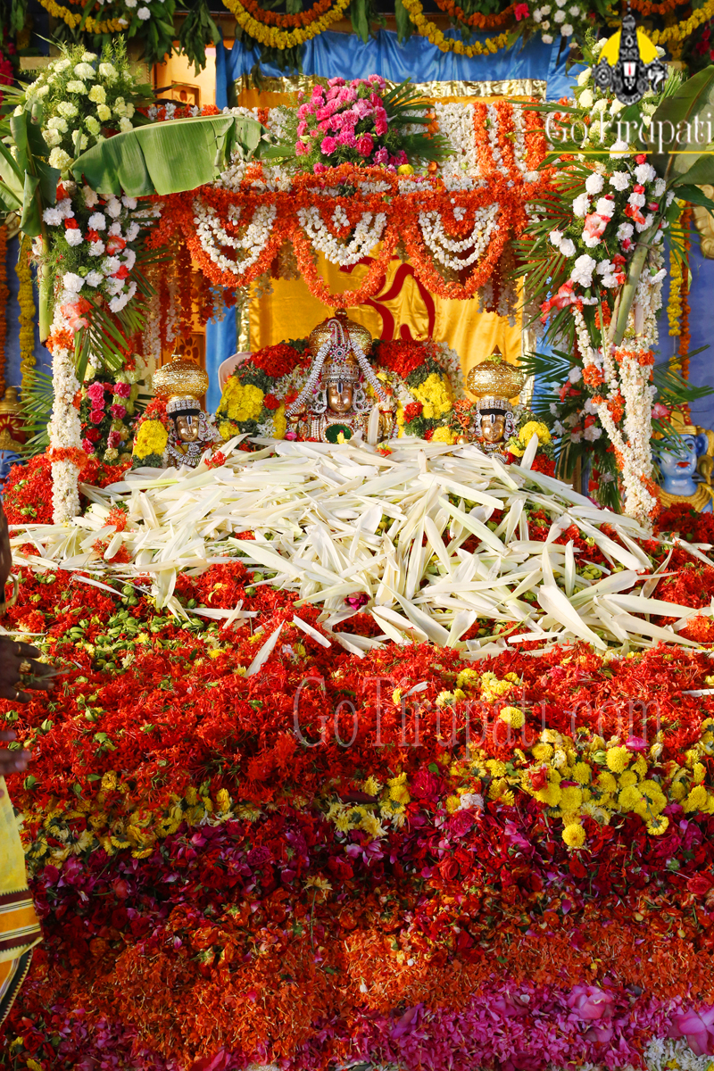 Over seven tonnes of a wide variety of bright, traditional, ornmanental and aromatic flowers were used in the festival. The Archakas initially offered the most sacred “Tulasi” followed by Lillies and Jasmine. Later floral beds out of Ganneru, Ixora, Manu Sampangi, Chemanti, Mugali were also laid one above other with tonnes of baskets of flowers.