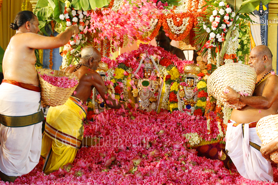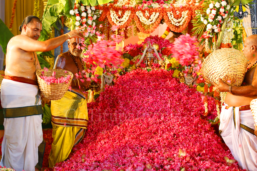 The celestial floral bath took place under the supervision of the Agama Scholar of TTD Dr Sundaravadanacharyulu. Before culminating the celestial fete which lasted for almost two and a half hours from 9am to 11:30am on Sunday, the priests chanted the hymns from Rig, Sukla Yajur, Krishna Yajur, Sama and Adharvana Vedas.