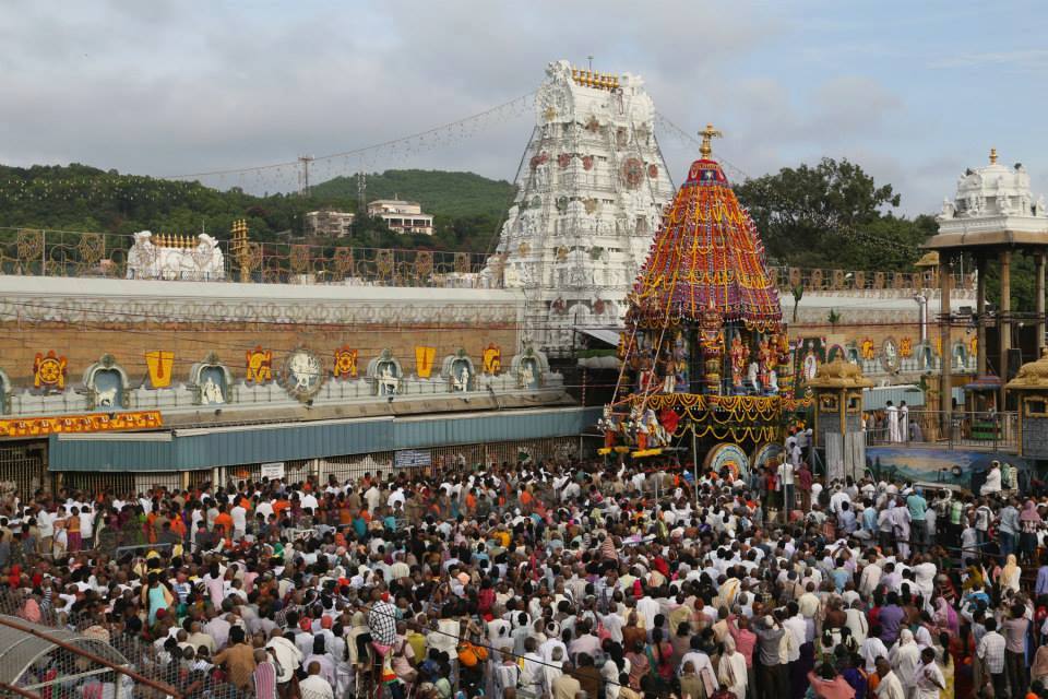 On the penultimate day of Srivari Salakatla Brahmotsavam, on the eighth day, the Malayapaswamy along with His consorts is seated on a high pedestal throne and is taken on a procession around the four- mada streets on a wooden chariot which is over 35- feet tall.