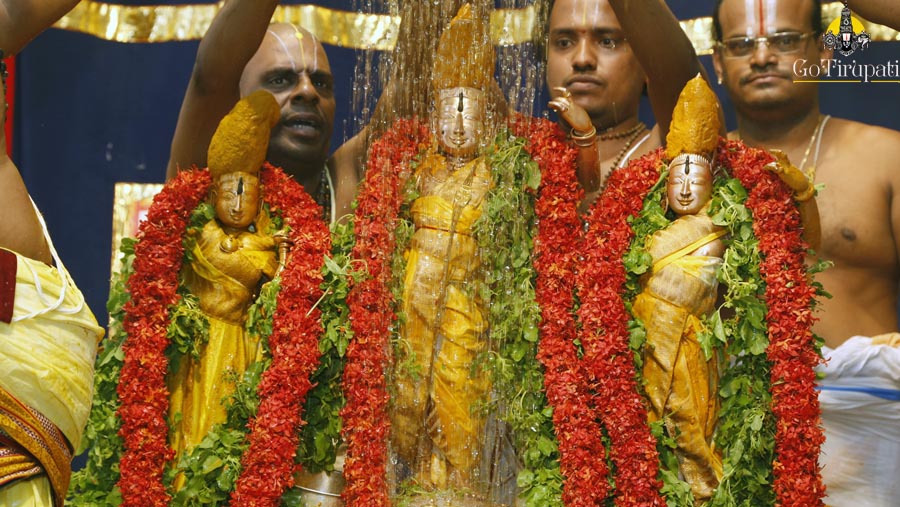 On first day Suprabhatam was performed to the deity and later the processional deities were rendered Snapana Tirumanjanam. Later in the evening the deities were taken out along the mada streets in a ceremonial procession. This event was followed by Pavitra Pratistha, Saynadhivasam in the evening between 7pm to 9pm.