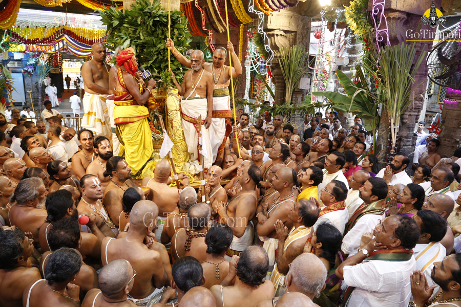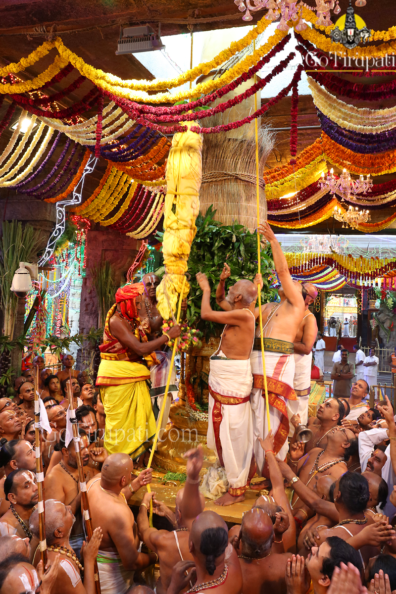 Dhwajarohanam has been carried out in a religious atmosphere amidst the chanting of Vedic mantras by the Archakas of the temple at the Dwajasthambham, near the Nadimi Padi Kavili inside the temple complex. The temple priests hoisted the celestial flag atop the temple pillar between 5pm to 5.30pm.
