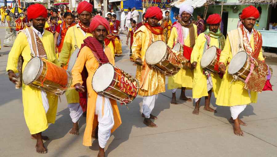 On the bright sunny day, the Goddess charmed as Panduranga Swamy with some marbles tied to one side of the vehicle (as if playing folk game gillankodi where in marbles are hit with a stick) and conch on other side.