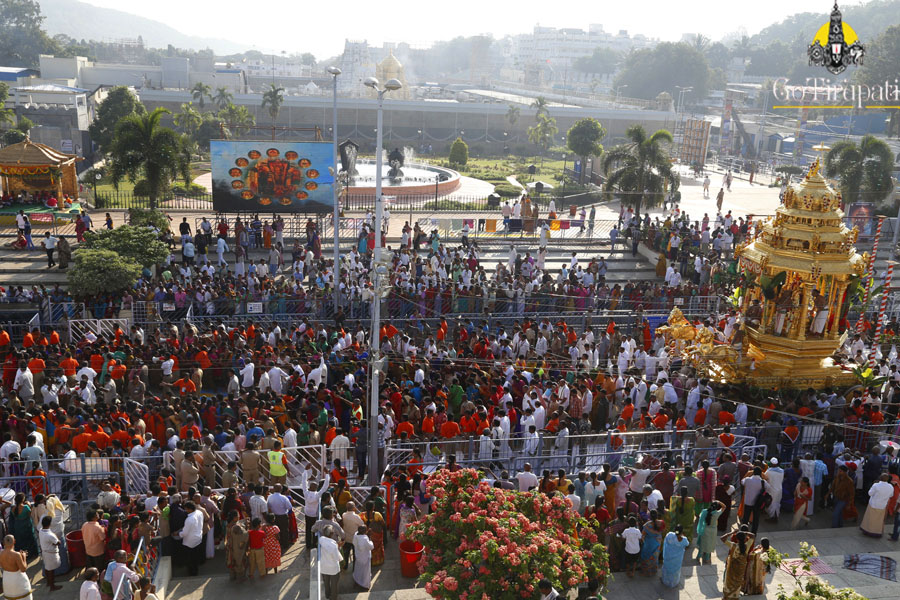 Lord traversed through the four mada streets seated majestically on the golden “Devasana Peetham” on the 30-feet mighty golden chariot.