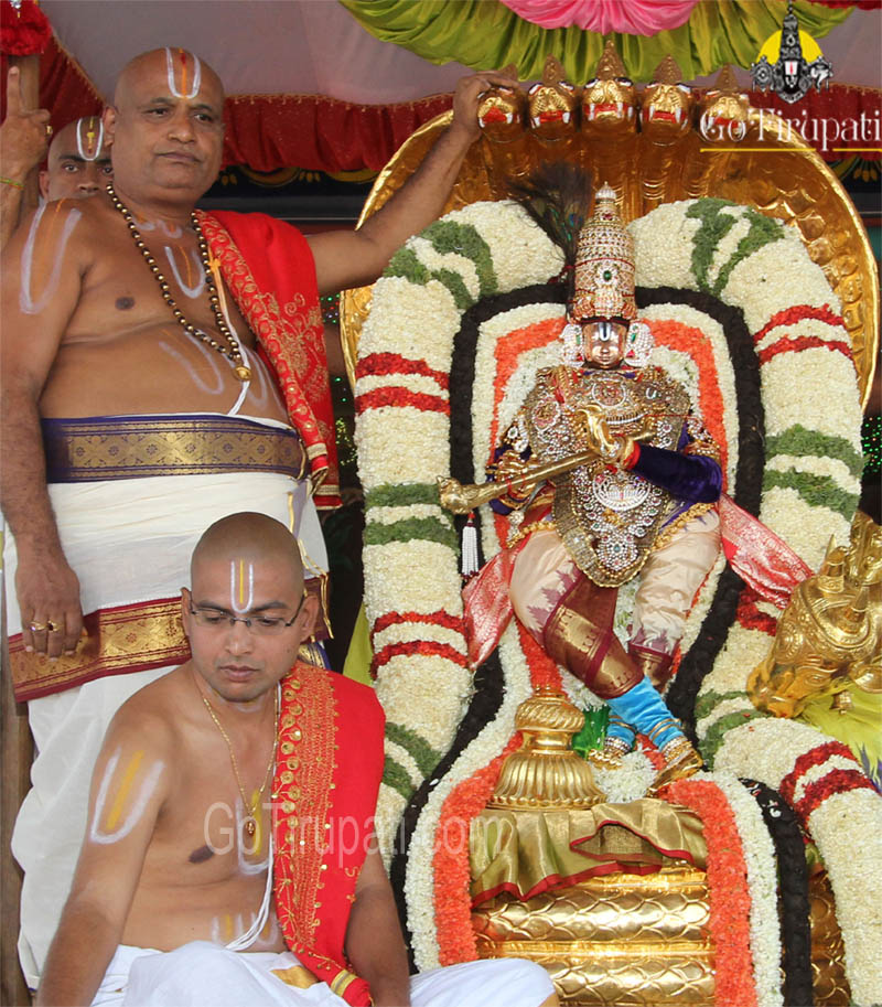 Tirumala, 17 September 2015: On the sunny morning of the on-going annual Brahmotsavams of Lord Venkateswara the processional deity of Lord Malayappa Swamy was taken out in a grand procession on ‘Chinna Sesha Vahanam’ around the holy mada’ streets encircling the holy shrine.