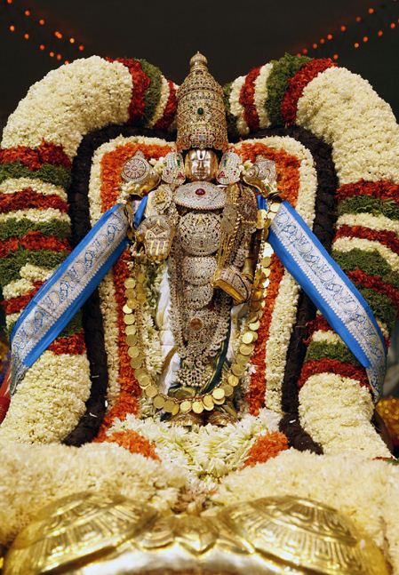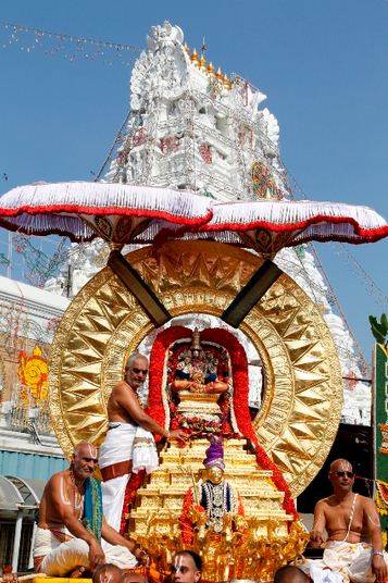 After the Daily Pujas, the Utsava murthi, Lord Sri Malayappa Swamy, along with His Consorts Sri Devi and Bhu Devi, are worshipped with a large variety of flowers and sweets.And in the evening these deities are taken out in a procession.