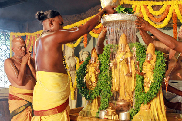 All the Idols and articles within the Sanctum are removed and the main deity inside Ananda Nilayam is covered with Water proof cloth. The sanctum including the floors, ceilings and walls are cleaned and brushed. The entire area is then cleaned thoroughly with water and smeared with vermilion, camphor, sandalwood paste, saffron, turmeric etc. Then the covering to the main deity is removed and all the articles and the other idols are replaced at their positions. After completing this event, the purificatory worship is carried out and Naivedyam is offered to the deity.